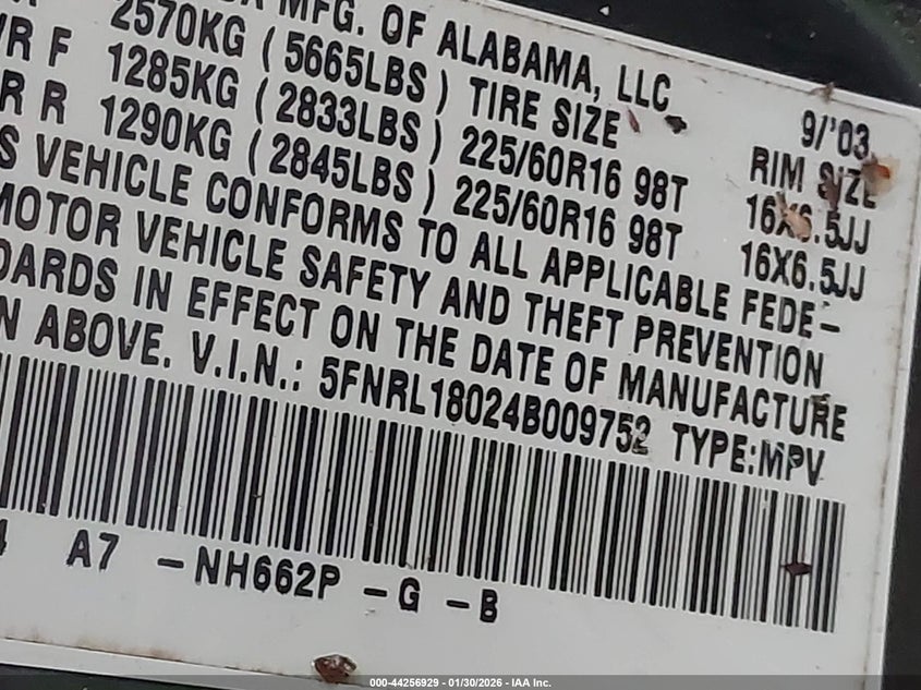 VIN: 5FNRL18024B009752