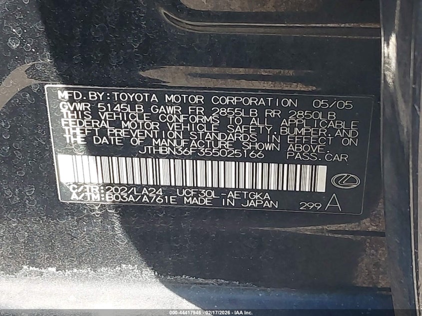 VIN: JTHBN36F355025166