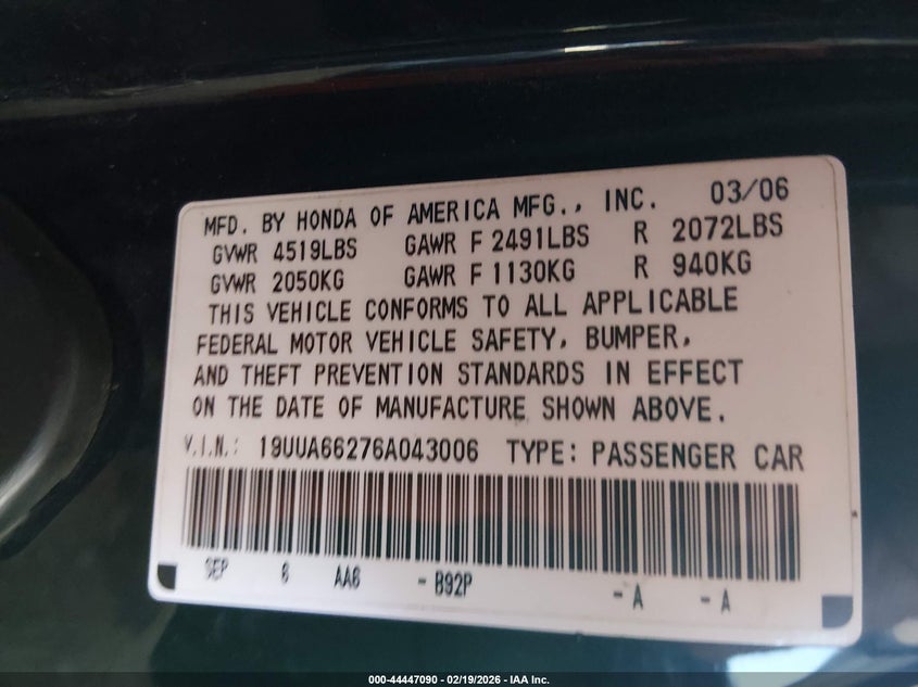 VIN: 19UUA66276A043006