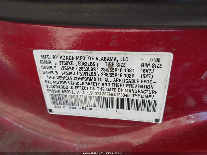 VIN: 5FNRL38766B123040