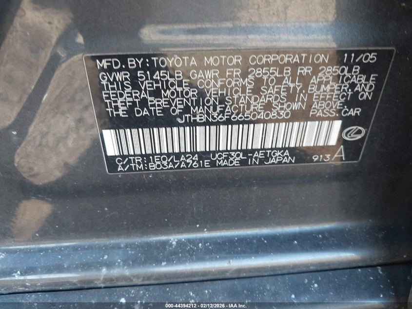 VIN: JTHBN36F665040830