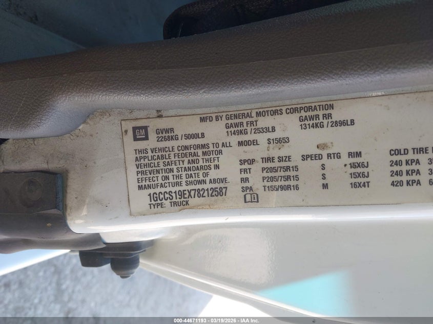VIN: 1GCCS19EX78212587