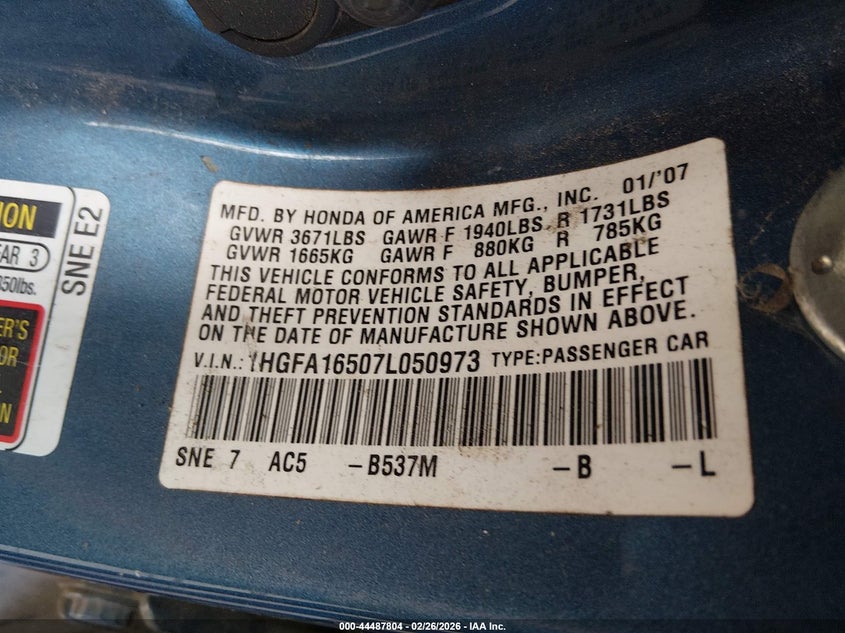 VIN: 1HGFA16507L050973