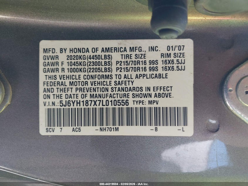 VIN: 5J6YH187X7L010556