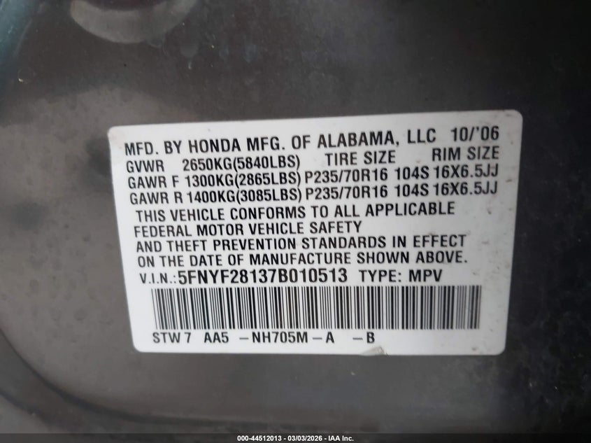 VIN: 5FNYF28137B010513