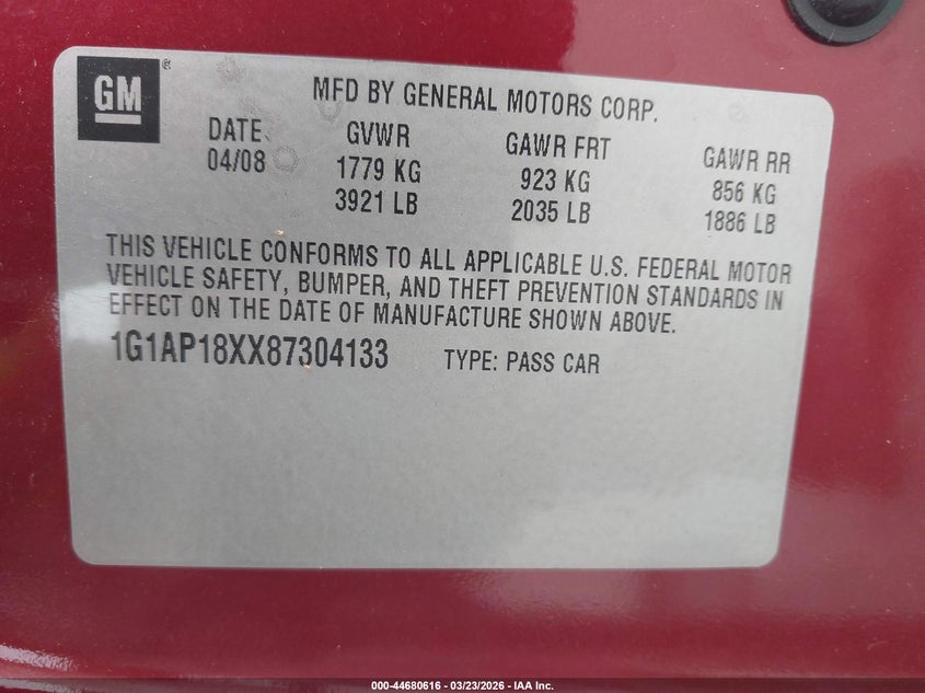 VIN: 1G1AP18XX87304133