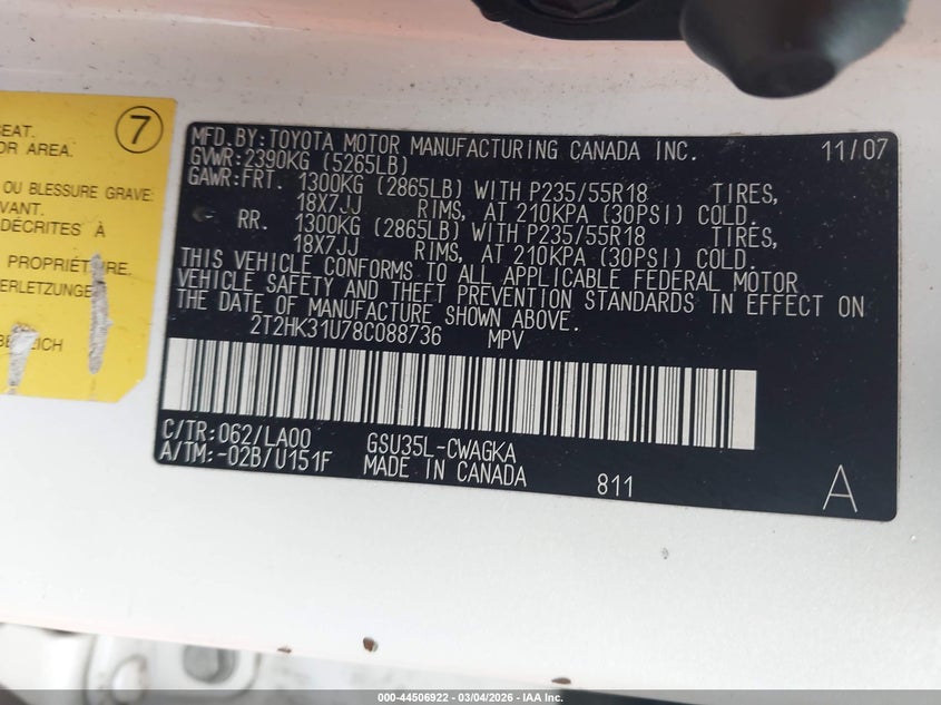 VIN: 2T2HK31U78C088736