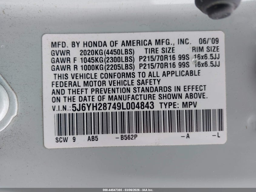 VIN: 5J6YH28749L004843