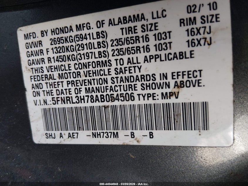 VIN: 5FNRL3H78AB054506