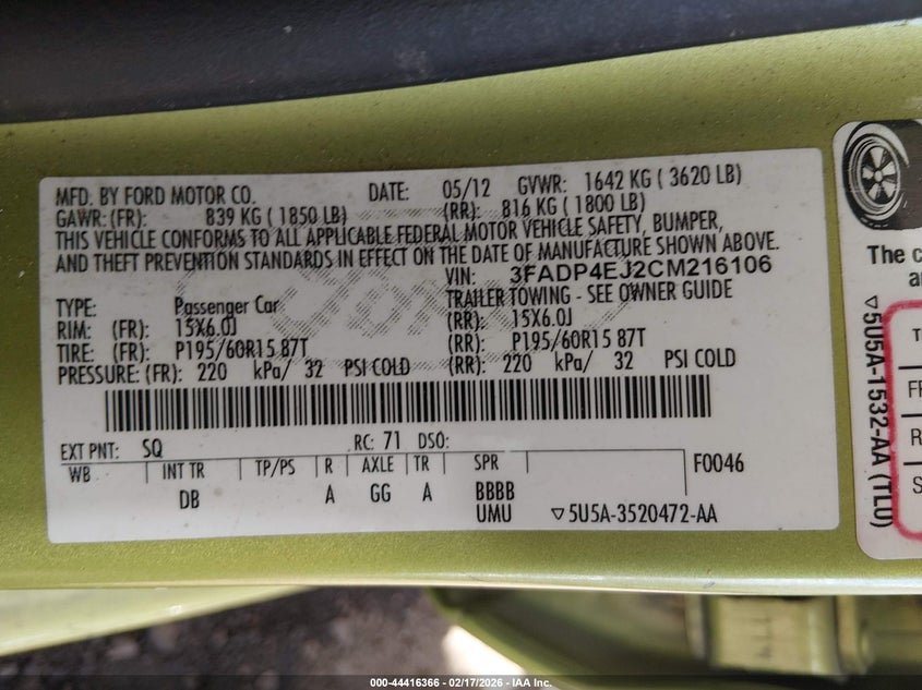 VIN: 3FADP4EJ2CM216106