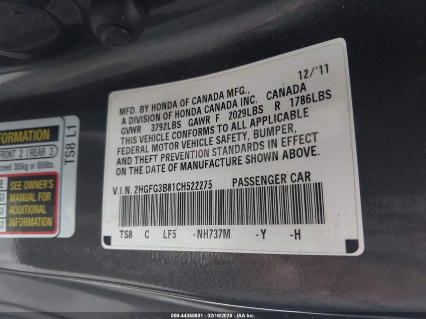 VIN: 2HGFG3B81CH522275