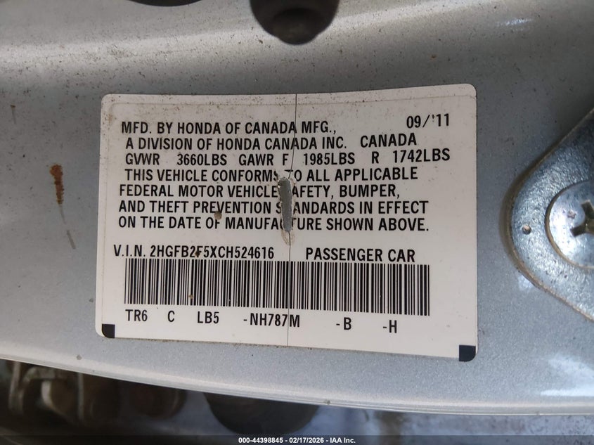 VIN: 2HGFB2F5XCH524616