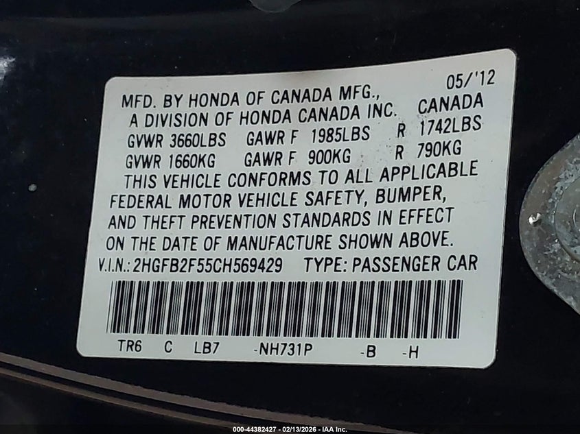 VIN: 2HGFB2F55CH569429