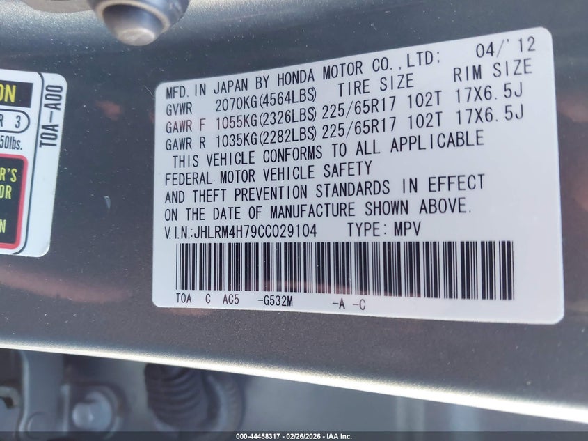 VIN: JHLRM4H79CC029104