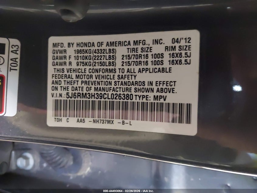 VIN: 5J6RM3H39CL026380