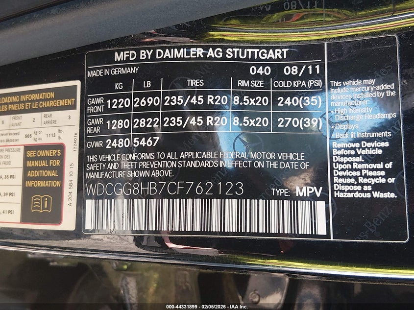 VIN: WDCGG8HB7CF762123
