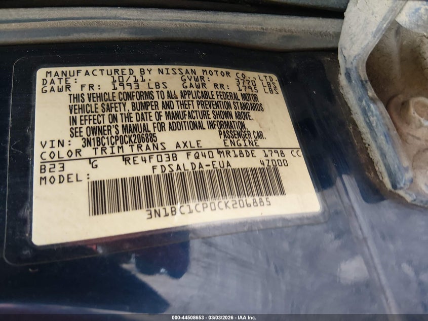 VIN: 3N1BC1CP0CK206885