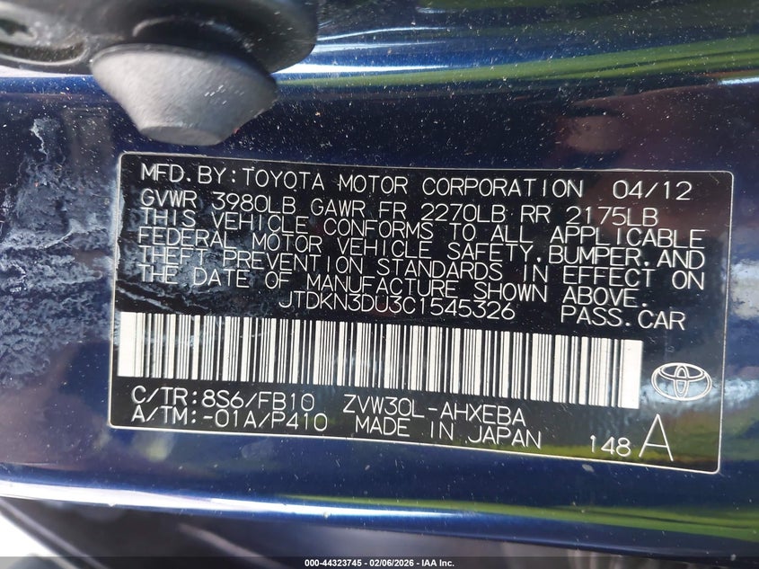 VIN: JTDKN3DU3C1545326