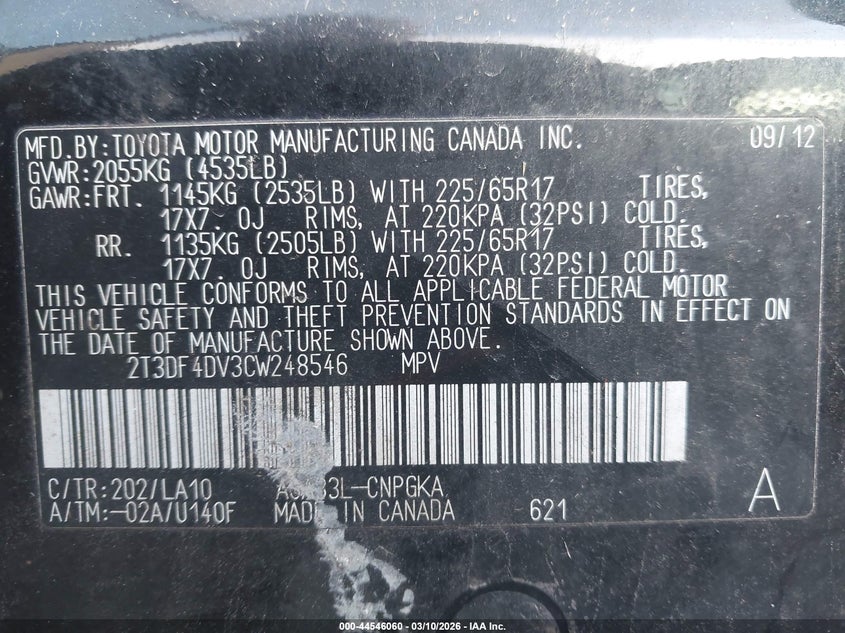 VIN: 2T3DF4DV3CW248546