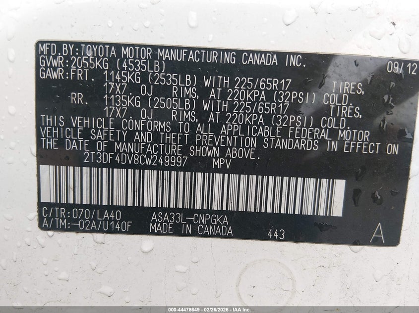 VIN: 2T3DF4DV8CW249997