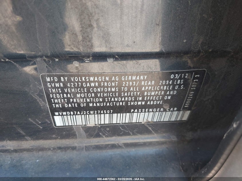 2012 VOLKSWAGEN GOLF 2.5L 4-DOOR