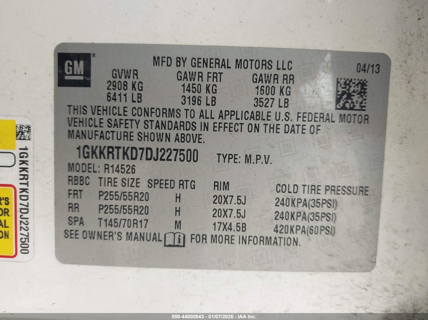 VIN: 1GKKRTKD7DJ227500