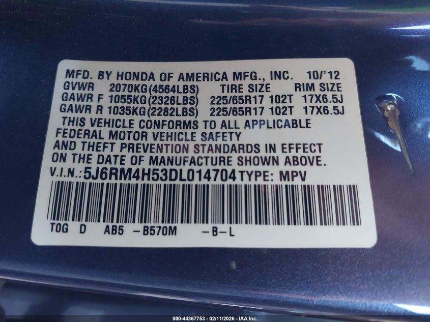 VIN: 5J6RM4H53DL014704