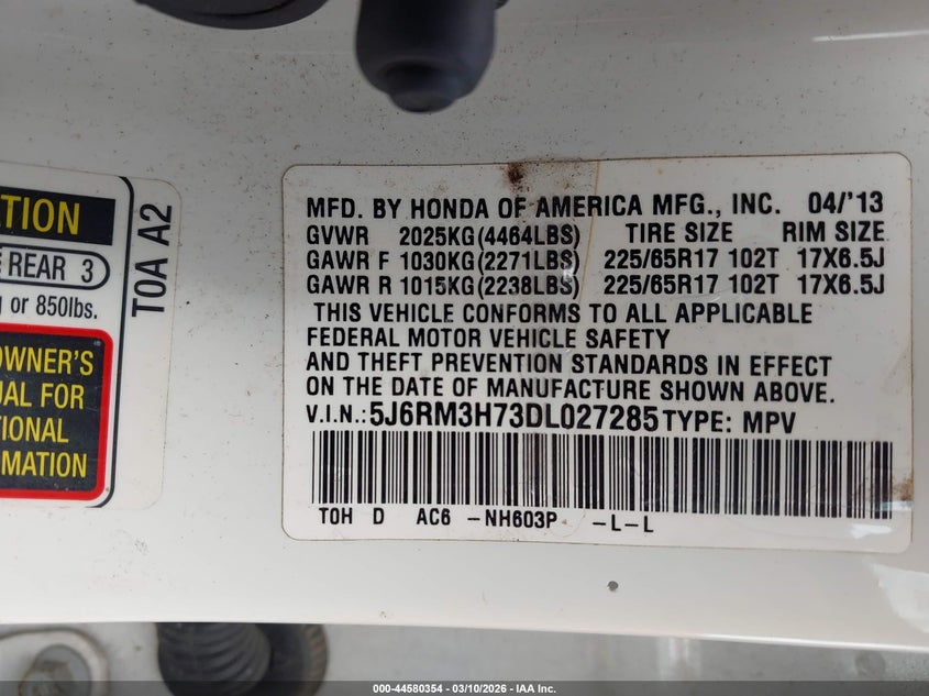 VIN: 5J6RM3H73DL027285