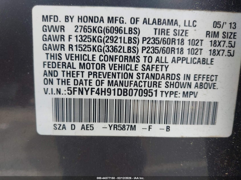 VIN: 5FNYF4H91DB070951