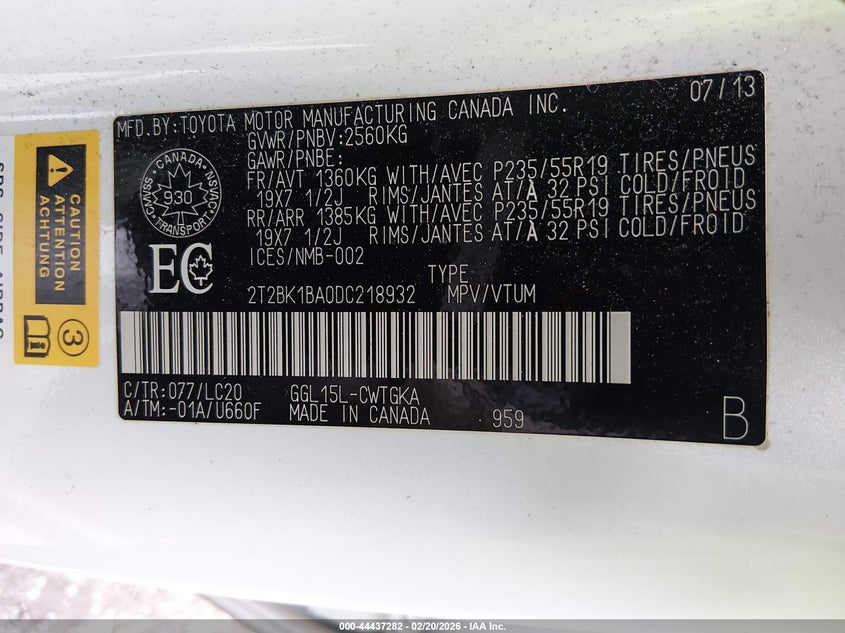 VIN: 2T2BK1BA0DC218932
