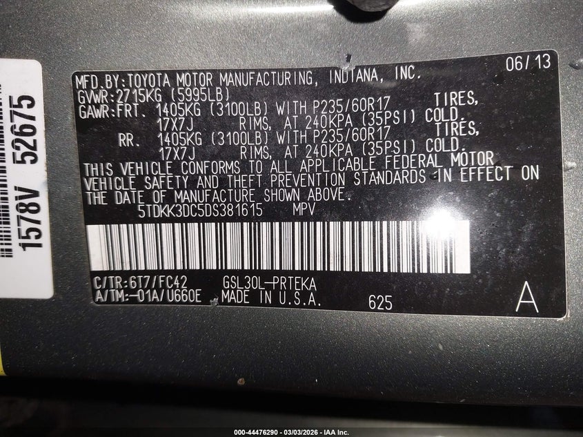 2013 TOYOTA SIENNA LE V6 8 PASSENGER