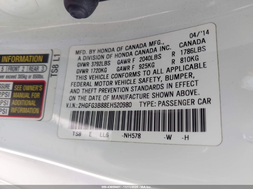 VIN: 2HGFG3B88EH520980
