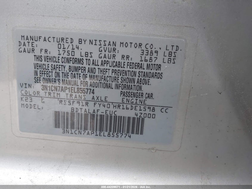 VIN: 3N1CN7AP1EL855774