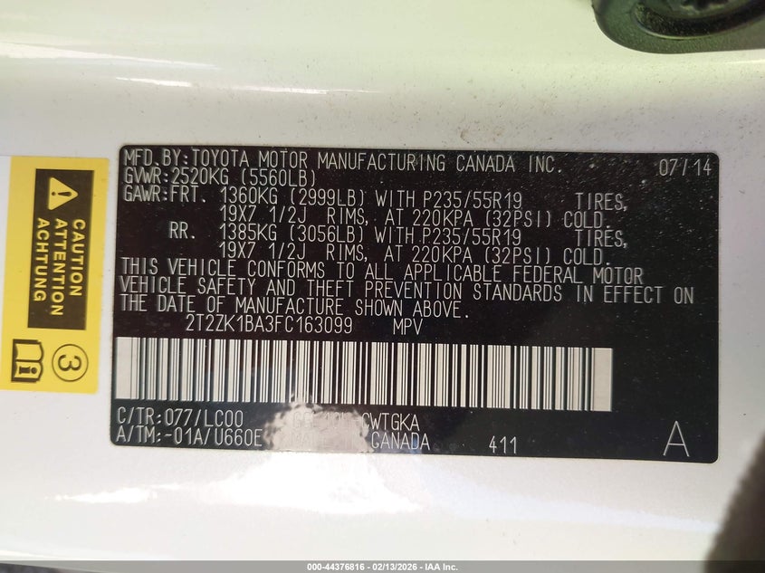 VIN: 2T2ZK1BA3FC163099