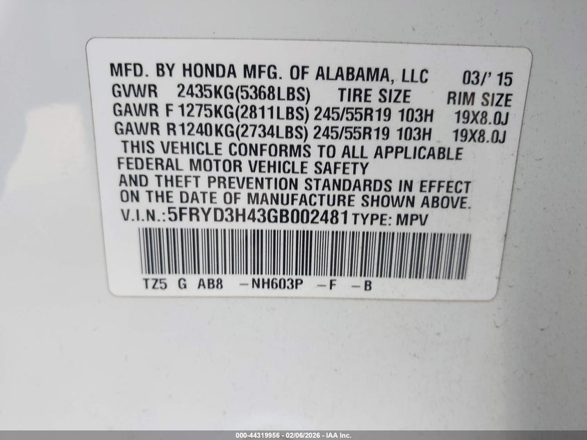 VIN: 5FRYD3H43GB002481