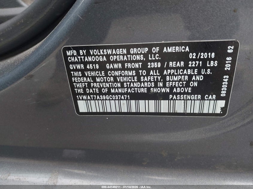 2016 VOLKSWAGEN PASSAT 1.8T S