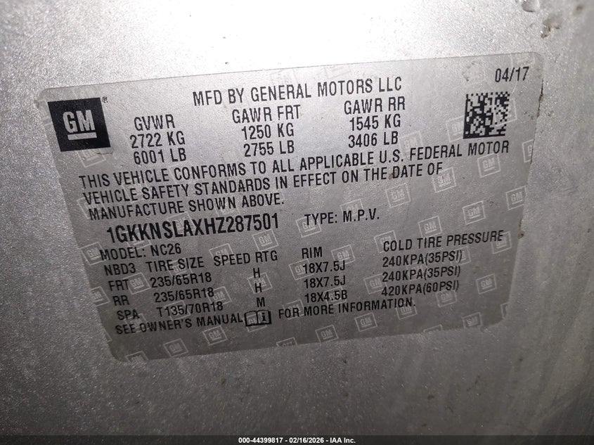 VIN: 1GKKNSLAXHZ287501