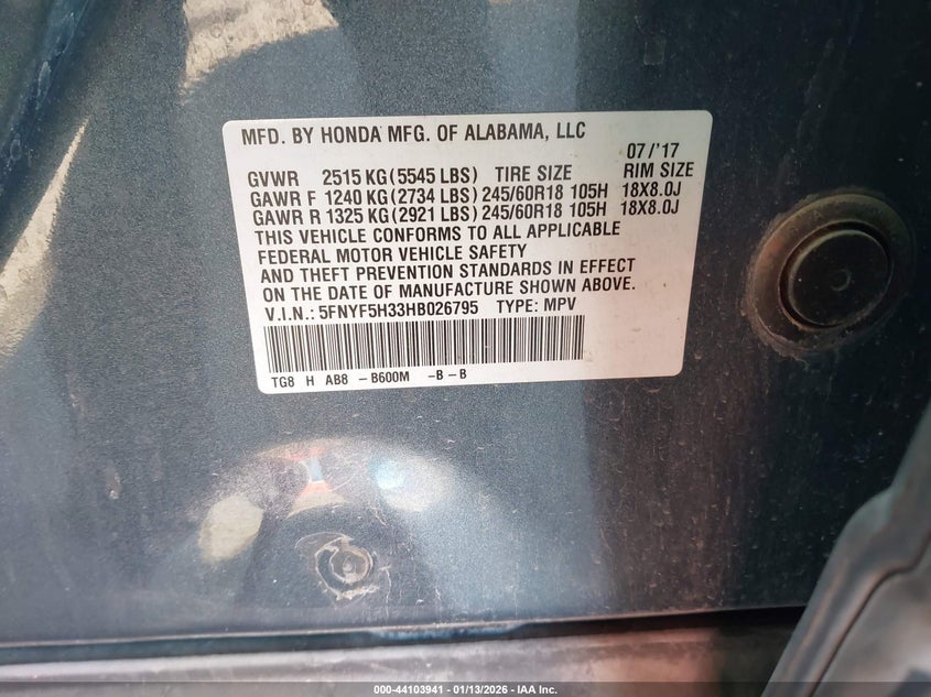 VIN: 5FNYF5H33HB026795
