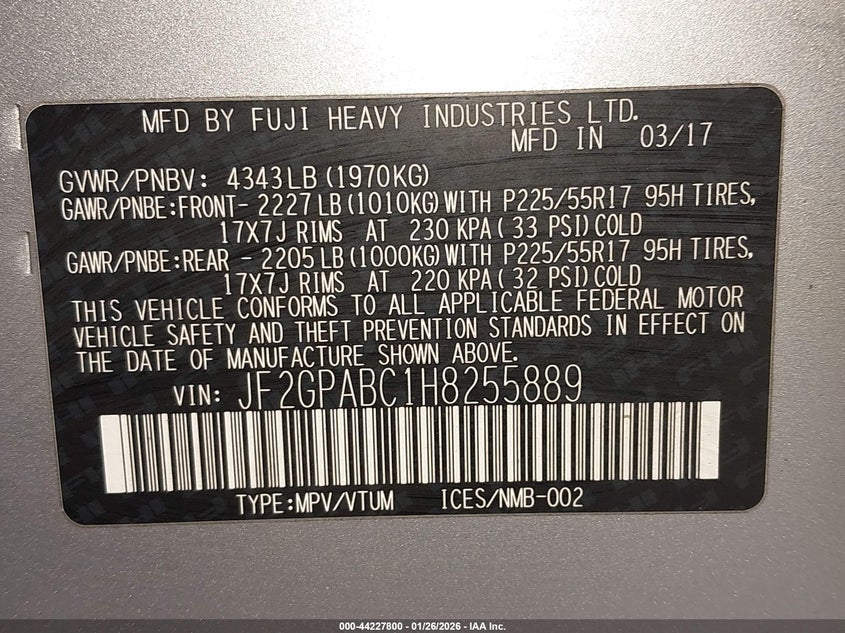VIN: JF2GPABC1H8255889