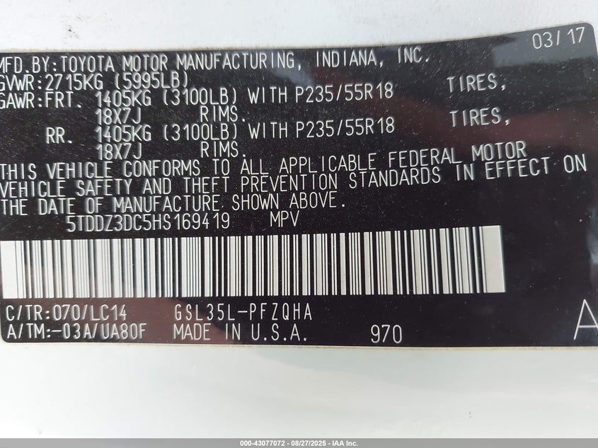 2017 TOYOTA SIENNA XLE 7 PASSENGER