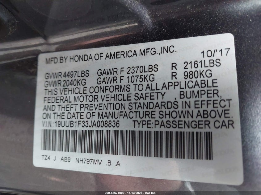 VIN: 19UUB1F33JA008836