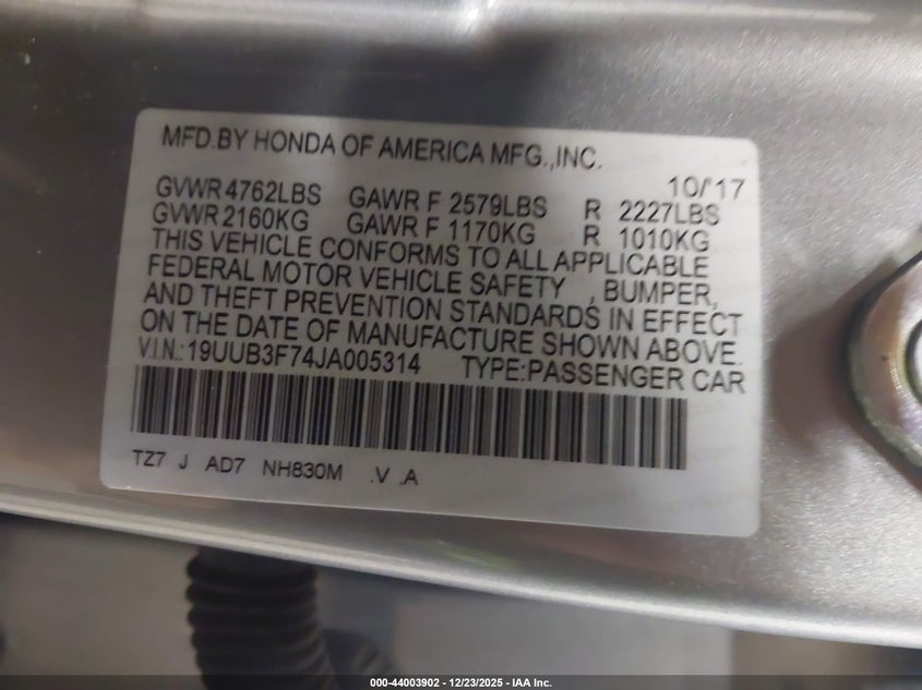 VIN: 19UUB3F74JA005314