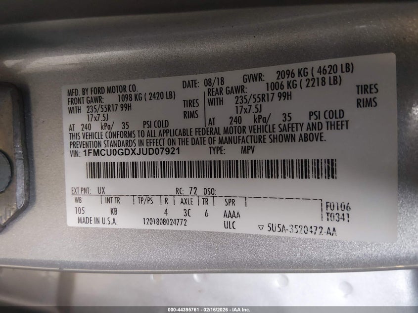 VIN: 1FMCU0GDXJUD07921