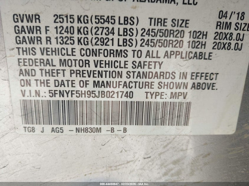 VIN: 5FNYF5H95JB021740