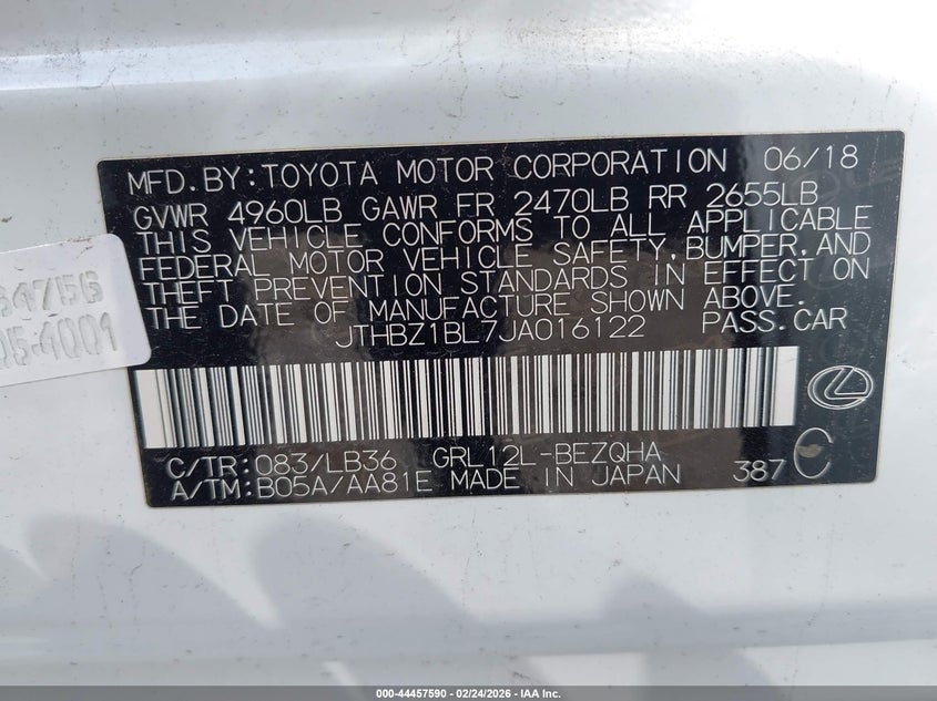 VIN: JTHBZ1BL7JA016122