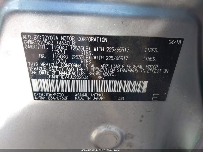 VIN: JTMRFREV4JJ222504