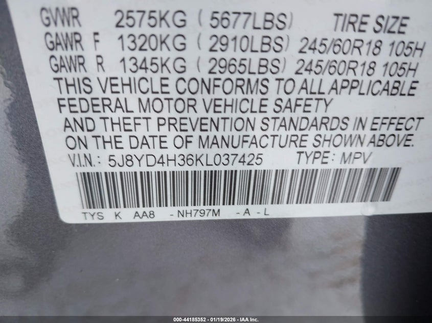 VIN: 5J8YD4H36KL037425