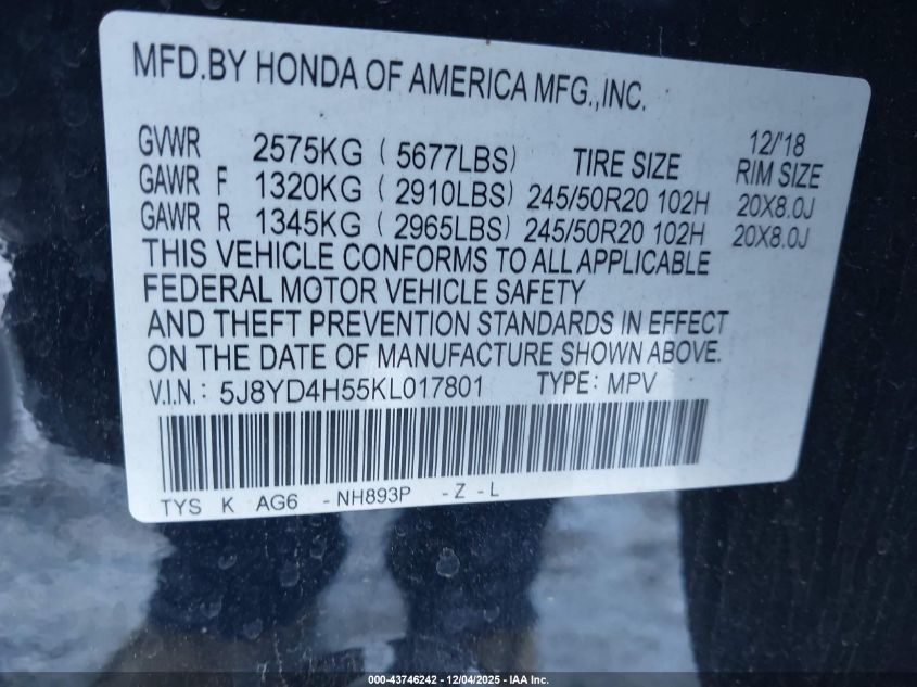 VIN: 5J8YD4H55KL017801
