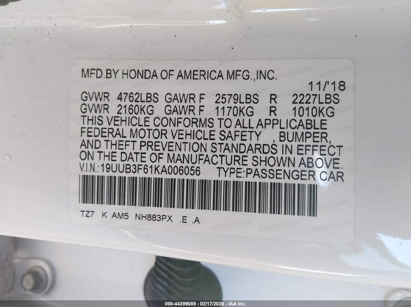 VIN: 19UUB3F61KA006056