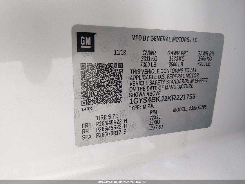 VIN: 1GYS4BKJ2KR221753